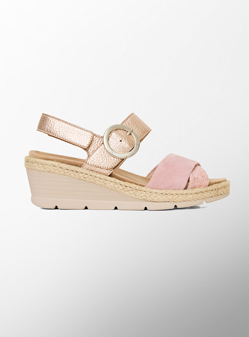 • Women’s orthopedic platform sandals in soft powder with suede accents and an adjustable strap