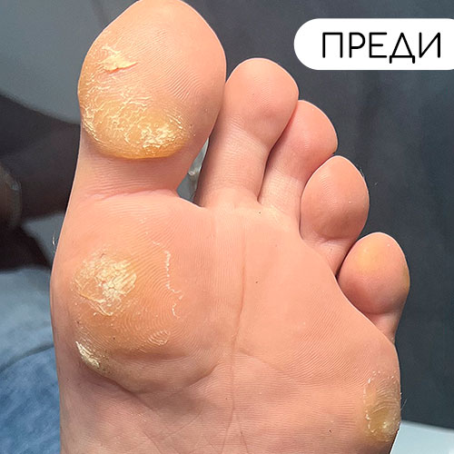 болка и всяка крачка за него беше изпитание. Причината? Мазоли! Опитвал се е у дома сам да премахне мазолите с макетно ножче и години наред така ги е третирал. За съжаление е премахвал и здрава част от кожата, която с времето загрубявала и мазолът растял. Когато вече осъзнал, че сам не може да си помогне, е потърсил помощ за премахване на мазолите. Премахнах мазола, направих индивидуални ортопедични стелки за моя клиент и сега посещава редовно процедурата „Премахване на мазол“. Сега той стъпва смело и комфортно без болка.